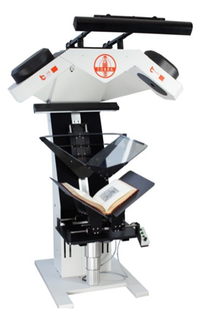 書本托架: v型電動化布局工作臺可以處理帶脊高達25 cm和處理重達30kg的書本,全自動電動V型光學級高精度玻璃壓稿臺。
